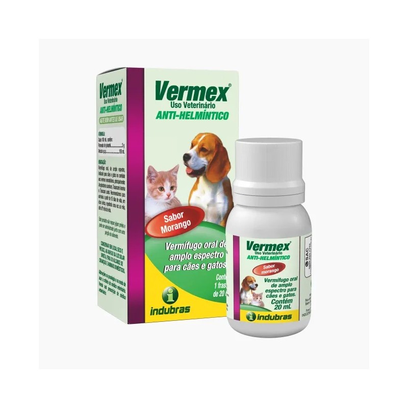 O Vermex Anti-Helmíntico 20ml Indubras é um vermífugo oral de amplo espectro, com sabor de morango, indicado para cães e gatos no combate aos vermes redondos nematódeos, como: Ancylostoma caninum, Toxocara canis e Toxascaris leonina.